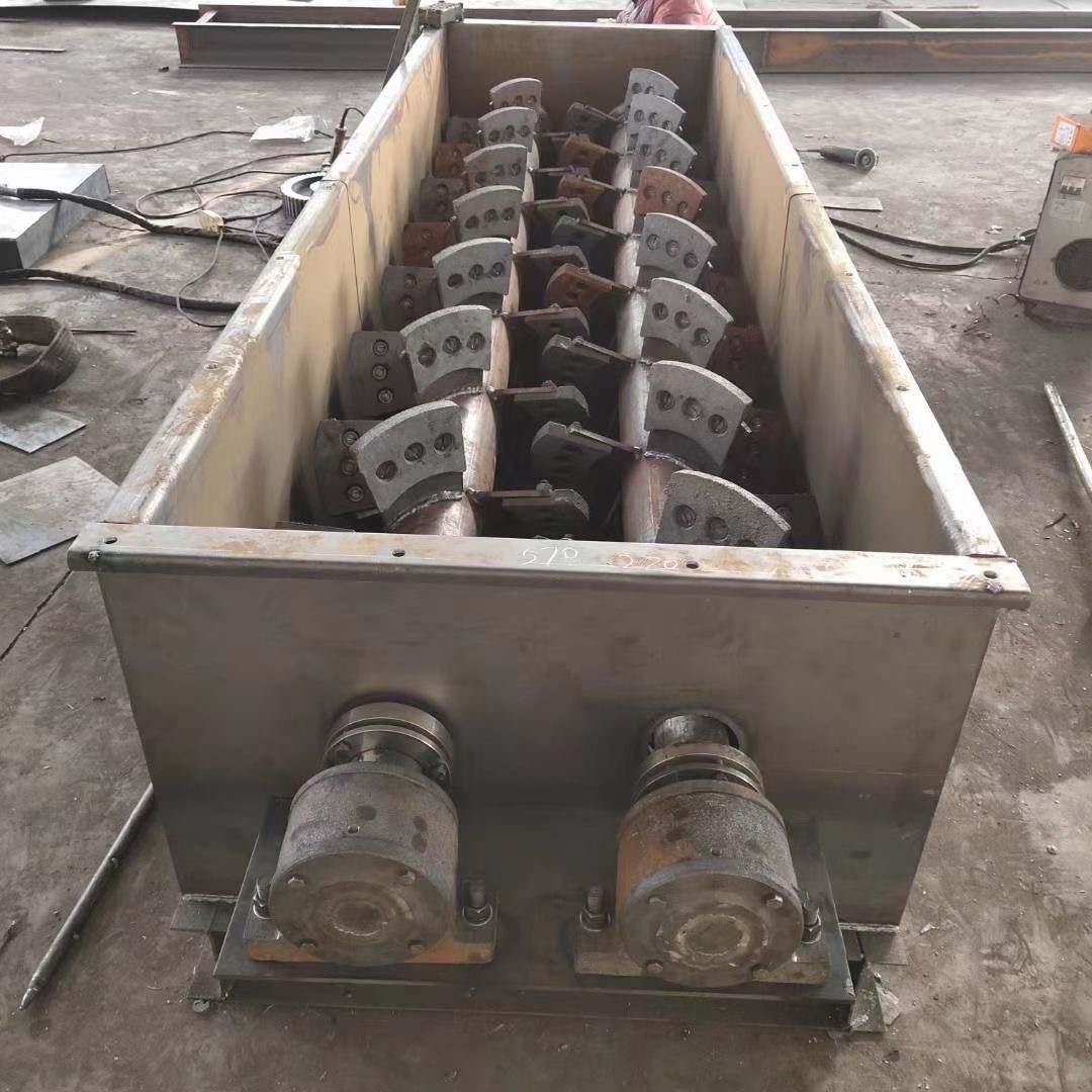 双轴搅拌机叶片选用耐磨损且不易粘灰的材料制成。叶片结构设计的合理简单,磨损之后易于更换,使用寿命长。加水调湿配管主要由接管、接头及喷嘴组成。喷嘴布置在搅拌机机壳内部上方,沿螺旋轴方向轴向排列,形成水帘雾状,以利于物料的加湿搅拌。喷嘴结构简单,易于更换,防腐耐用。 通过操作供水管道上的手动调节阀可以调节湿灰的含水率。盖板主要包括左盖板、中间盖、右盖板、孔盖及检修孔盖等,便于操作人员平时的检修及保养。